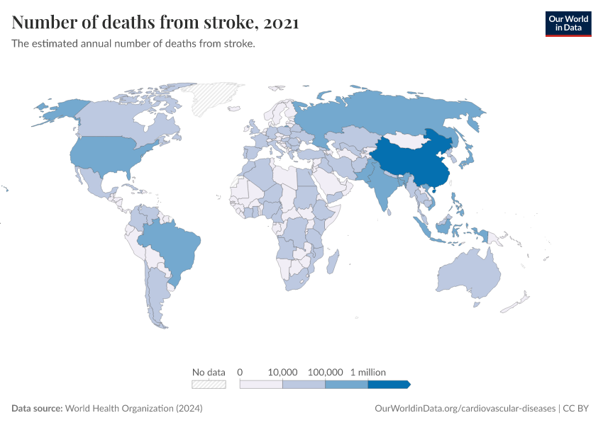 World Health Organization (2024) – with major processing by Our World in Data. “Number of deaths from stroke” [dataset]. World Health Organization, “Global Health Estimates” [original data]. Retrieved February 24, 2026 from https://categorical-map-color.owid.pages.dev/grapher/deaths-from-strokes-ghe
