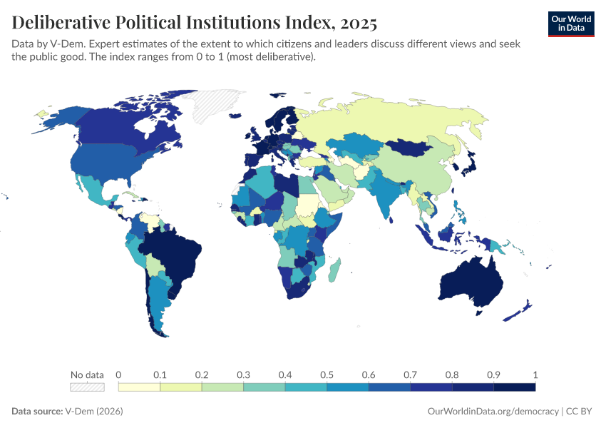 “Data Page: Deliberative political institutions index”, part of the following publication: Bastian Herre, Lucas Rodés-Guirao, and Esteban Ortiz-Ospina (2013) - “Democracy”. Data adapted from V-Dem. Retrieved from https://categorical-map-color.owid.pages.dev/grapher/deliberative-political-institutions-index [online resource]How to cite this data