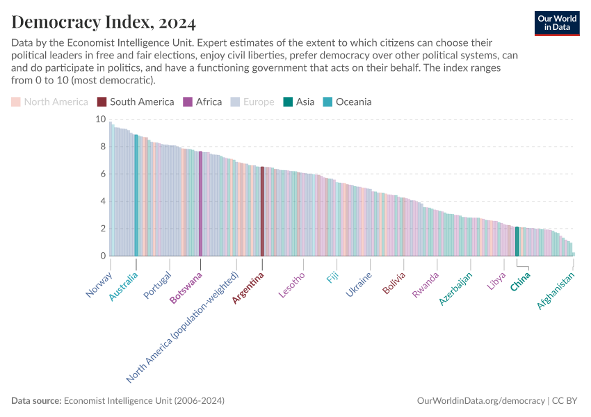 Economist Intelligence Unit (2006-2024) – processed by Our World in Data. “Democracy index – Economist Intelligence Unit” [dataset]. Economist Intelligence Unit, “Democracy Index 2021: The China challenge”; Economist Intelligence Unit, “Democracy Index 2022: Frontline democracy and the battle for Ukraine”; Economist Intelligence Unit, “Democracy Index 2023: Age of Conflict”; Economist Intelligence Unit, “Democracy Index 2024: What's wrong with representative democracy?”; Gapminder, “Democracy Index v4”; Various sources, “Population” [original data]. Retrieved February 24, 2026 from https://categorical-map-color.owid.pages.dev/grapher/democracy-index-eiu