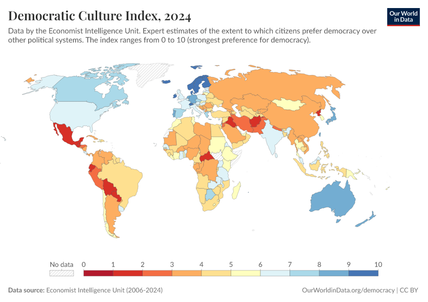 Economist Intelligence Unit (2006-2024) – processed by Our World in Data. “Democratic Culture Index” [dataset]. Economist Intelligence Unit, “Democracy Index 2021: The China challenge”; Economist Intelligence Unit, “Democracy Index 2022: Frontline democracy and the battle for Ukraine”; Economist Intelligence Unit, “Democracy Index 2023: Age of Conflict”; Economist Intelligence Unit, “Democracy Index 2024: What's wrong with representative democracy?”; Gapminder, “Democracy Index v4”; Various sources, “Population” [original data]. Retrieved February 24, 2026 from https://categorical-map-color.owid.pages.dev/grapher/democratic-culture-index-eiu