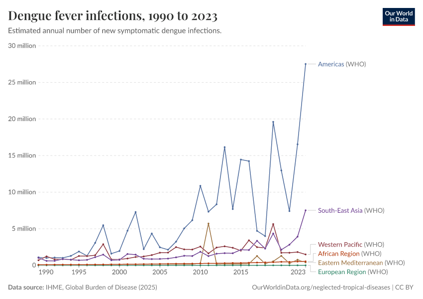 IHME, Global Burden of Disease (2025) – with major processing by Our World in Data. “Dengue fever infections” [dataset]. IHME, Global Burden of Disease, “Global Burden of Disease - Prevalence and Incidence” [original data]. Retrieved February 24, 2026 from https://categorical-map-color.owid.pages.dev/grapher/dengue-incidence