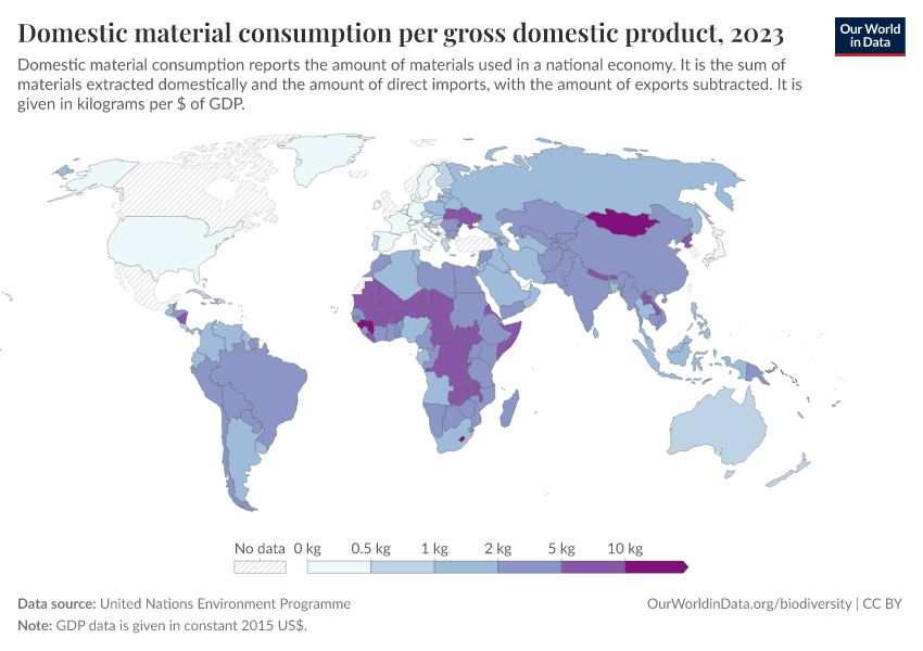 “Data Page: Domestic material consumption per gross domestic product”. Our World in Data (2026). Data adapted from United Nations Environment Programme. Retrieved from https://categorical-map-color.owid.pages.dev/grapher/domestic-material-consumption-per-unit-of-gdp [online resource]How to cite this data