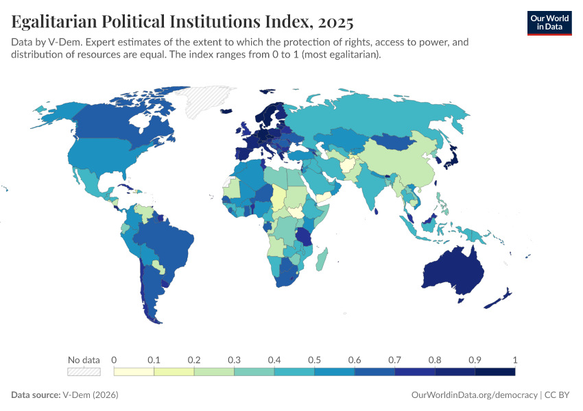 “Data Page: Egalitarian political institutions index”, part of the following publication: Bastian Herre, Lucas Rodés-Guirao, and Esteban Ortiz-Ospina (2013) - “Democracy”. Data adapted from V-Dem. Retrieved from https://categorical-map-color.owid.pages.dev/grapher/egalitarian-political-institutions-index [online resource]How to cite this data