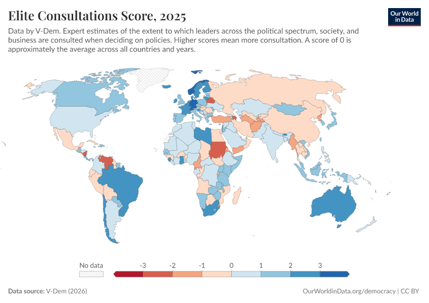 “Data Page: Elite consultation”, part of the following publication: Bastian Herre, Lucas Rodés-Guirao, and Esteban Ortiz-Ospina (2013) - “Democracy”. Data adapted from V-Dem. Retrieved from https://categorical-map-color.owid.pages.dev/grapher/elite-consultations-score [online resource]How to cite this data