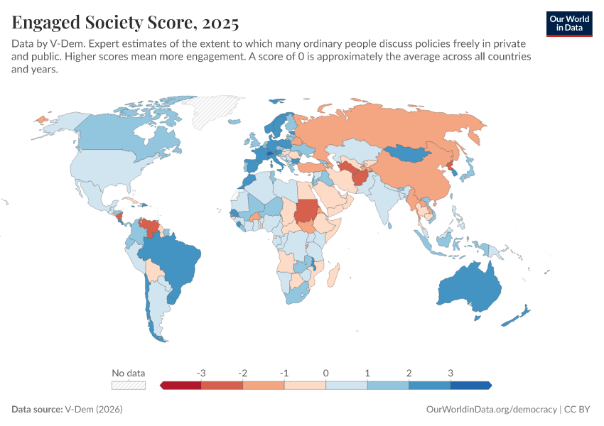 “Data Page: Engaged society”, part of the following publication: Bastian Herre, Lucas Rodés-Guirao, and Esteban Ortiz-Ospina (2013) - “Democracy”. Data adapted from V-Dem. Retrieved from https://categorical-map-color.owid.pages.dev/grapher/engaged-society-score [online resource]How to cite this data