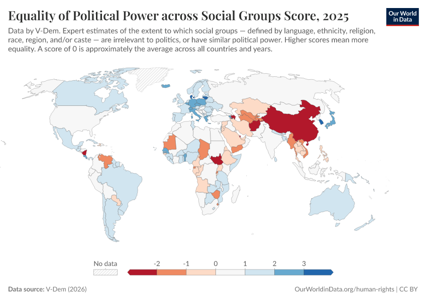 “Data Page: Equality of political power across social groups”, part of the following publication: Bastian Herre, Lucas Rodés-Guirao, and Esteban Ortiz-Ospina (2013) - “Democracy”. Data adapted from V-Dem. Retrieved from https://categorical-map-color.owid.pages.dev/grapher/equality-of-political-power-across-social-groups-score [online resource]How to cite this data