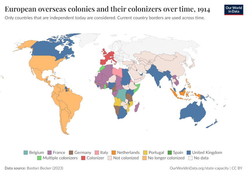 “Data Page: European overseas colonies and their colonizers over time”, part of the following publication: Bastian Herre and Pablo Arriagada (2023) - “State Capacity”. Data adapted from Bastian Becker. Retrieved from https://categorical-map-color.owid.pages.dev/grapher/european-overseas-colonies-and-their-colonizers [online resource]How to cite this data