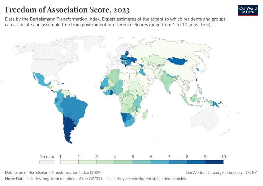 “Data Page: Freedom of Association Score”, part of the following publication: Bastian Herre, Lucas Rodés-Guirao, and Esteban Ortiz-Ospina (2013) - “Democracy”. Data adapted from Bertelsmann Transformation Index. Retrieved from https://categorical-map-color.owid.pages.dev/grapher/freedom-of-association-score-bti [online resource]How to cite this data
