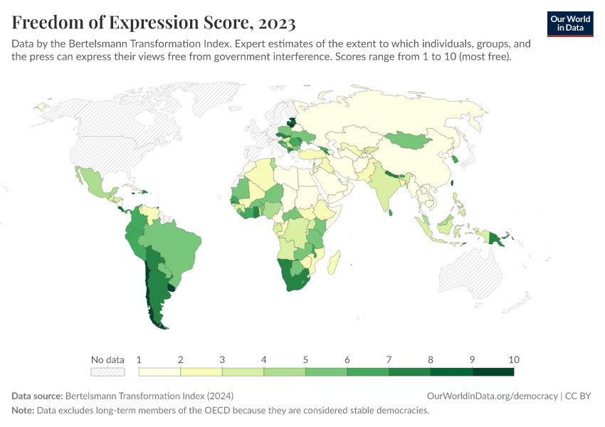 “Data Page: Freedom of Expression Score”, part of the following publication: Bastian Herre, Lucas Rodés-Guirao, and Esteban Ortiz-Ospina (2013) - “Democracy”. Data adapted from Bertelsmann Transformation Index. Retrieved from https://categorical-map-color.owid.pages.dev/grapher/freedom-of-expression-score-bti [online resource]How to cite this data