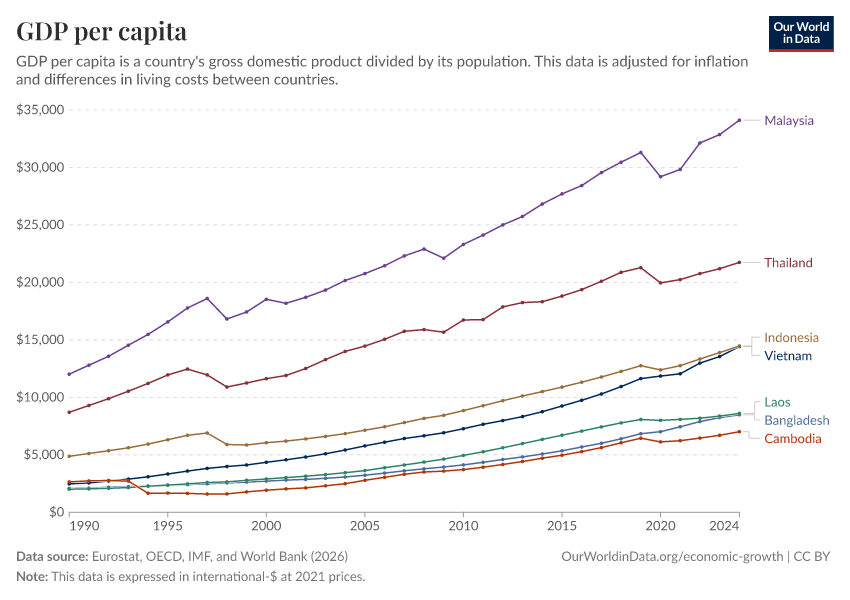“Data Page: GDP per capita”, part of the following publication: Max Roser, Bertha Rohenkohl, Pablo Arriagada, Joe Hasell, Hannah Ritchie, and Esteban Ortiz-Ospina (2023) - “Economic Growth”. Data adapted from Eurostat, OECD, IMF, and World Bank. Retrieved from https://categorical-map-color.owid.pages.dev/grapher/gdp-per-capita-worldbank [online resource]How to cite this data