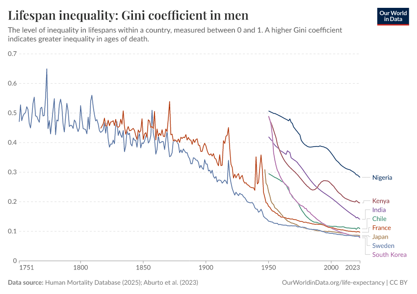 “Data Page: Lifespan inequality: Gini coefficient in men”, part of the following publication: Saloni Dattani, Lucas Rodés-Guirao, Hannah Ritchie, Esteban Ortiz-Ospina, and Max Roser (2023) - “Life Expectancy”. Data adapted from Human Mortality Database, United Nations. Retrieved from https://categorical-map-color.owid.pages.dev/grapher/gini-coefficient-of-lifespan-inequality-in-males [online resource]How to cite this data