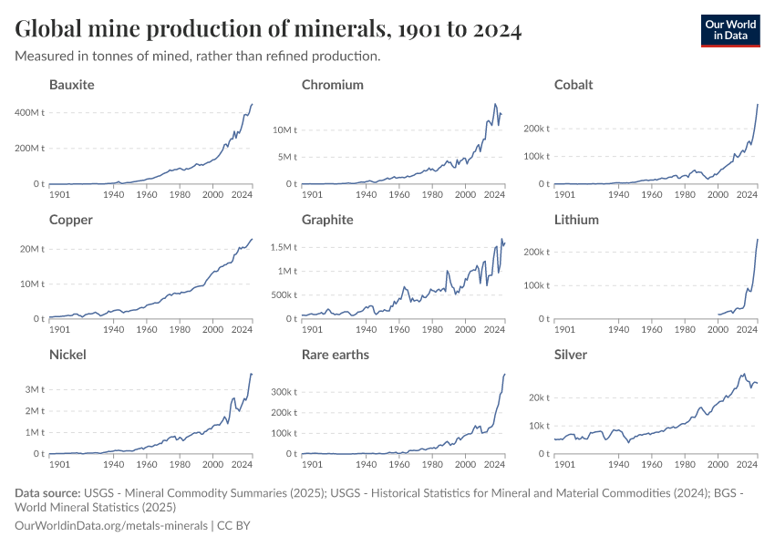 USGS - Mineral Commodity Summaries (2025); USGS - Historical Statistics for Mineral and Material Commodities (2024); BGS - World Mineral Statistics (2025) – with major processing by Our World in Data. “Global mine production of minerals” [dataset]. United States Geological Survey, “Mineral Commodity Summaries”; United States Geological Survey, “Historical Statistics for Mineral and Material Commodities”; British Geological Survey, “World Mineral Statistics” [original data]. Retrieved February 24, 2026 from https://categorical-map-color.owid.pages.dev/grapher/global-mine-production-minerals