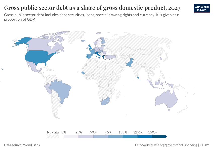 “Data Page: Gross public sector debt as a share of gross domestic product”. Our World in Data (2026). Data adapted from World Bank. Retrieved from https://categorical-map-color.owid.pages.dev/grapher/gross-public-sector-debt-as-a-proportion-of-gdp [online resource]How to cite this data