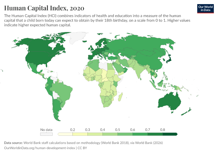“Data Page: Human Capital Index”. Our World in Data (2026). Data adapted from World Bank staff calculations based on methodology (World Bank 2018), via World Bank. Retrieved from https://categorical-map-color.owid.pages.dev/grapher/human-capital-index-in-2018 [online resource]How to cite this data