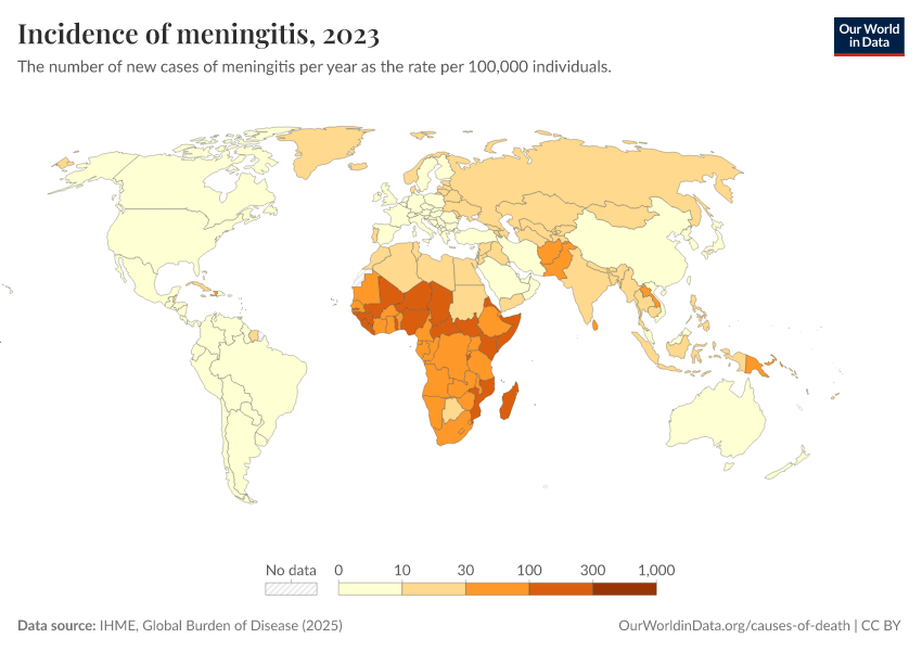 “Data Page: Incidence of meningitis”, part of the following publication: Esteban Ortiz-Ospina and Max Roser (2016) - “Global Health”. Data adapted from IHME, Global Burden of Disease. Retrieved from https://categorical-map-color.owid.pages.dev/grapher/incidence-of-meningitis [online resource]How to cite this data