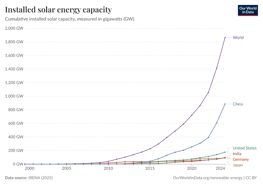 “Data Page: Total solar capacity”, part of the following publication: Hannah Ritchie, Pablo Rosado, and Max Roser (2023) - “Energy”. Data adapted from IRENA. Retrieved from https://categorical-map-color.owid.pages.dev/grapher/installed-solar-pv-capacity [online resource]How to cite this data