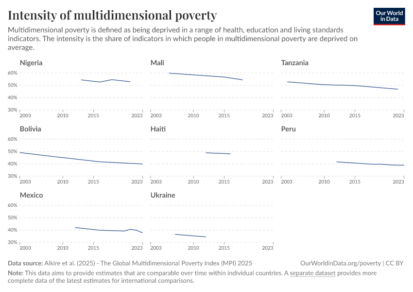 Alkire et al. (2025) - The Global Multidimensional Poverty Index (MPI) 2025 – with minor processing by Our World in Data. “Intensity of multidimensional poverty – Harmonized over time” [dataset]. Alkire et al., “Global Multidimensional Poverty Index (MPI) 2025” [original data]. Retrieved February 24, 2026 from https://categorical-map-color.owid.pages.dev/grapher/intensity-of-multidimensional-poverty-hot