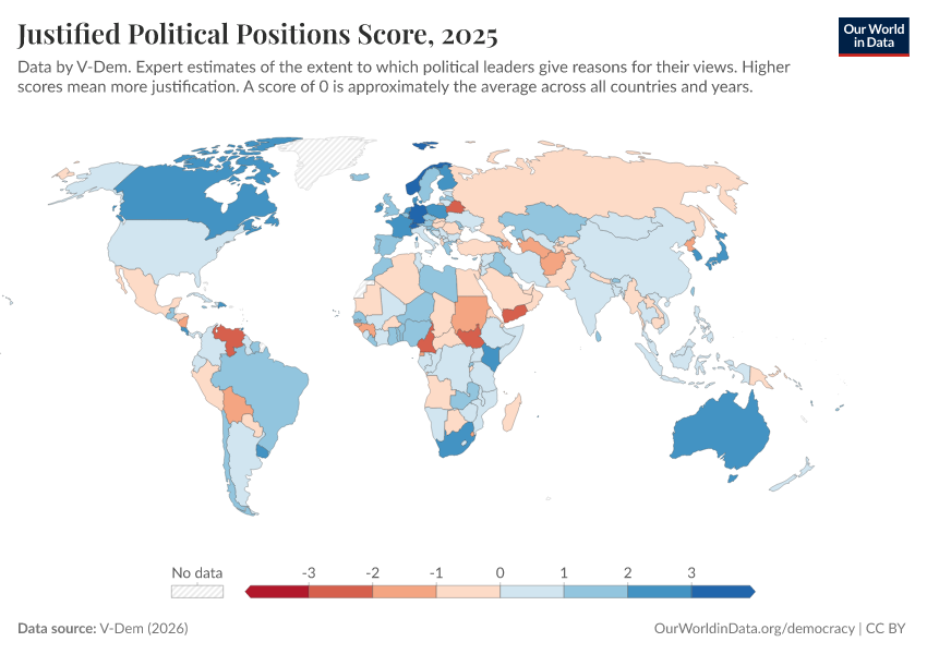 “Data Page: Justified political positions”, part of the following publication: Bastian Herre, Lucas Rodés-Guirao, and Esteban Ortiz-Ospina (2013) - “Democracy”. Data adapted from V-Dem. Retrieved from https://categorical-map-color.owid.pages.dev/grapher/justified-political-positions-score [online resource]How to cite this data
