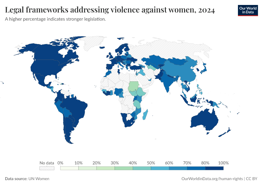 “Data Page: Legal frameworks addressing violence against women”. Our World in Data (2026). Data adapted from UN Women. Retrieved from https://categorical-map-color.owid.pages.dev/grapher/legal-frameworks-regarding-violence-against-women [online resource]How to cite this data