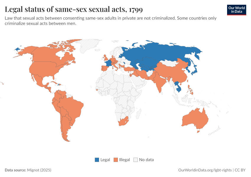 “Data Page: Legal status of same-sex sexual acts”, part of the following publication: Bastian Herre and Pablo Arriagada (2023) - “LGBT+ Rights”. Data adapted from Mignot. Retrieved from https://categorical-map-color.owid.pages.dev/grapher/legal-status-of-same-sex-sexual-acts [online resource]How to cite this data