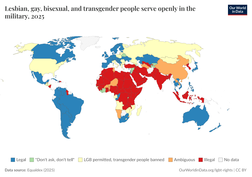 “Data Page: Lesbian, gay, bisexual, and transgender people serve openly in the military”, part of the following publication: Bastian Herre and Pablo Arriagada (2023) - “LGBT+ Rights”. Data adapted from Equaldex. Retrieved from https://categorical-map-color.owid.pages.dev/grapher/lgbt-military-equaldex [online resource]How to cite this data