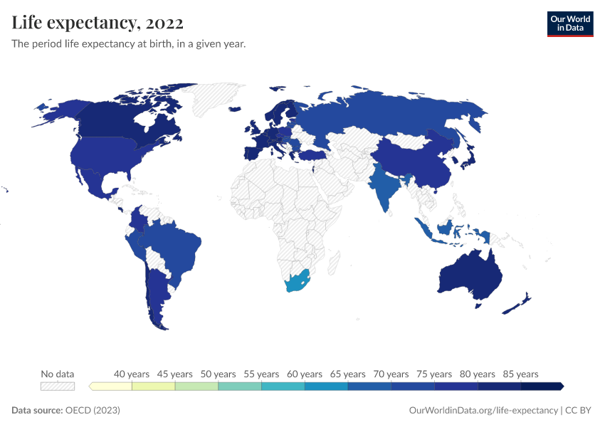 “Data Page: Life expectancy at birth”, part of the following publication: Saloni Dattani, Lucas Rodés-Guirao, Hannah Ritchie, Esteban Ortiz-Ospina, and Max Roser (2023) - “Life Expectancy”. Data adapted from OECD. Retrieved from https://categorical-map-color.owid.pages.dev/grapher/life-expectancy-at-birth-oecd [online resource]How to cite this data