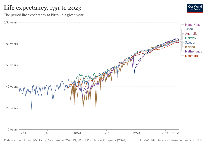 “Data Page: Life expectancy at birth”, part of the following publication: Saloni Dattani, Lucas Rodés-Guirao, Hannah Ritchie, Esteban Ortiz-Ospina, and Max Roser (2023) - “Life Expectancy”. Data adapted from Human Mortality Database, United Nations. Retrieved from https://categorical-map-color.owid.pages.dev/grapher/life-expectancy-hmd-unwpp [online resource]
