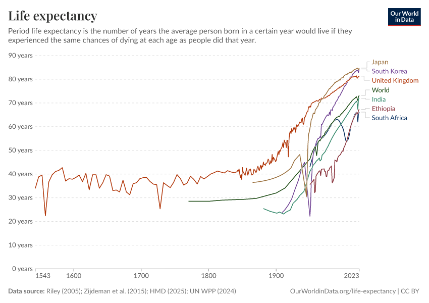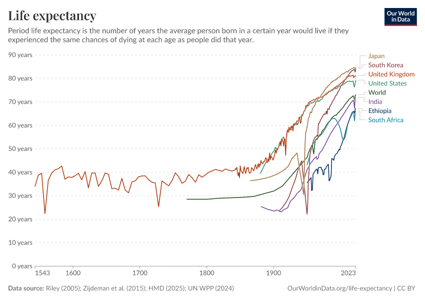 - This chart shows long-run estimates of life expectancy compiled by our team from several data sources. Before 1950, for country-level data, we rely on the Human Mortality Database (2025) combined with Zijdeman (2015). For regional data, we use Riley (2005). From 1950 onward, we use the United Nations World Population Prospects (2024).