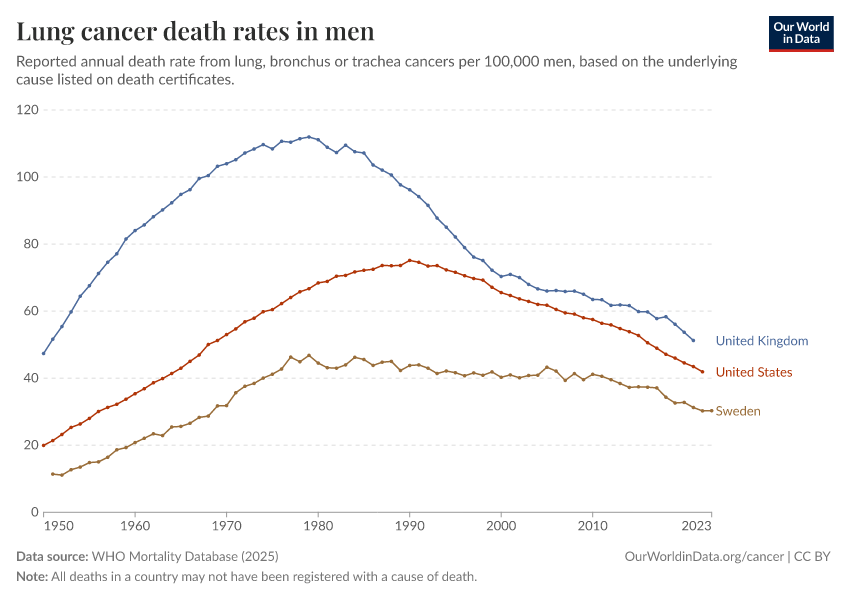“Data Page: Lung cancer death rates in men”, part of the following publication: Saloni Dattani, Fiona Spooner, Hannah Ritchie, and Max Roser (2023) - “Causes of Death”. Data adapted from WHO Mortality Database. Retrieved from https://categorical-map-color.owid.pages.dev/grapher/lung-cancer-death-rates-males [online resource]How to cite this data