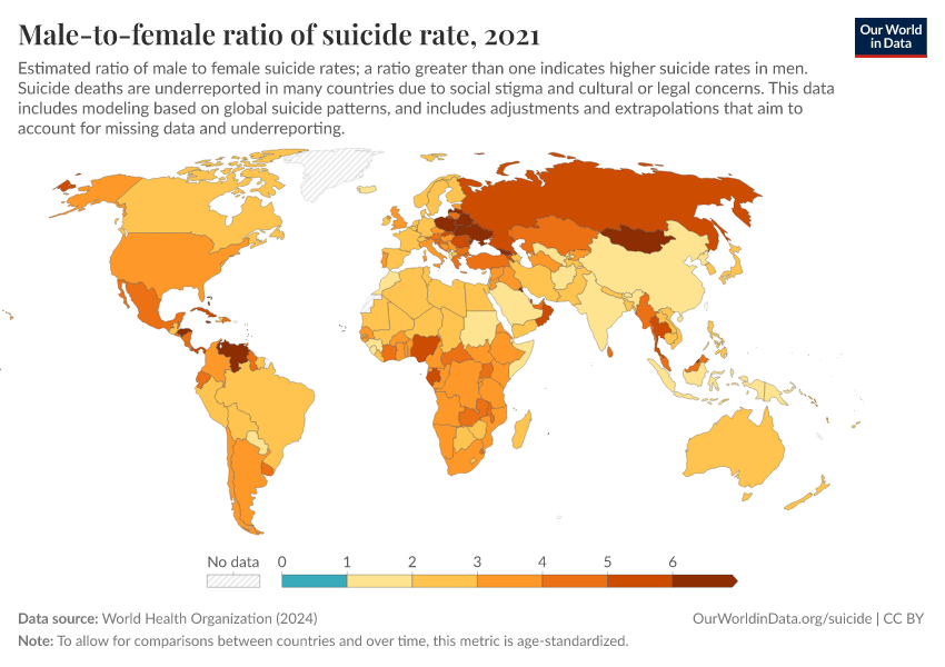 “Data Page: Male-to-female ratio of suicide rate”, part of the following publication: Esteban Ortiz-Ospina and Max Roser (2016) - “Global Health”. Data adapted from World Health Organization. Retrieved from https://categorical-map-color.owid.pages.dev/grapher/male-female-ratio-suicides-rates [online resource]How to cite this data