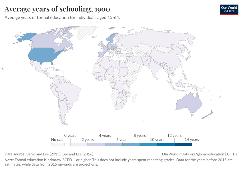 “Data Page: Average years of schooling”, part of the following publication: Hannah Ritchie, Veronika Samborska, Esteban Ortiz-Ospina, and Max Roser (2023) - “Global Education”. Data adapted from Barro and Lee, Lee and Lee. Retrieved from https://categorical-map-color.owid.pages.dev/grapher/mean-years-of-schooling-long-run [online resource]