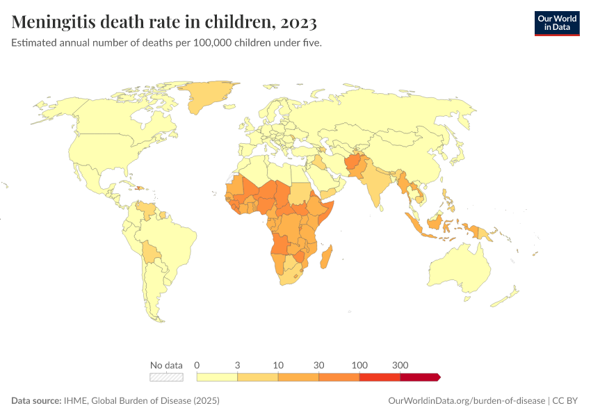 IHME, Global Burden of Disease (2025) – with major processing by Our World in Data. “Meningitis death rate in children” [dataset]. IHME, Global Burden of Disease, “Global Burden of Disease - Deaths” [original data]. Retrieved February 24, 2026 from https://categorical-map-color.owid.pages.dev/grapher/meningitis-death-rates-children-under-5