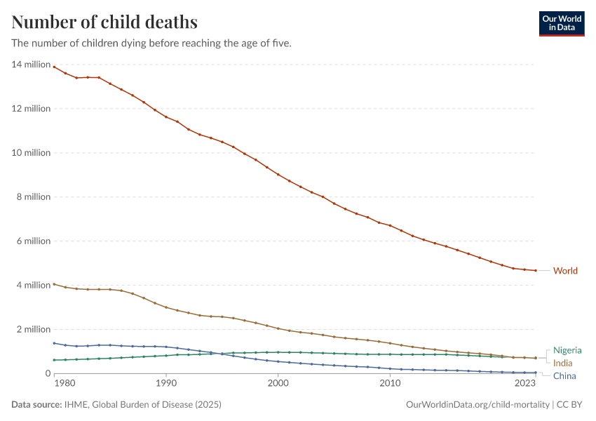 IHME, Global Burden of Disease (2025) – with major processing by Our World in Data. “Number of child deaths” [dataset]. IHME, Global Burden of Disease, “Global Burden of Disease - Deaths” [original data]. Retrieved February 24, 2026 from https://categorical-map-color.owid.pages.dev/grapher/number-of-child-deaths
