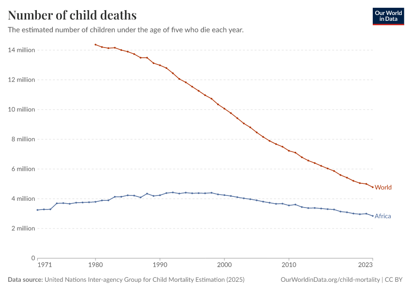 “Data Page: Under-five deaths”, part of the following publication: Saloni Dattani, Fiona Spooner, Hannah Ritchie, and Max Roser (2023) - “Child and Infant Mortality”. Data adapted from United Nations Inter-agency Group for Child Mortality Estimation, Various sources. Retrieved from https://categorical-map-color.owid.pages.dev/grapher/number-of-child-deaths-igme [online resource]