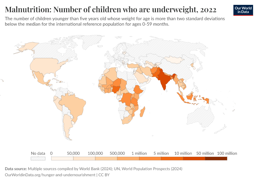 “Data Page: Number of underweight children”. Our World in Data (2026). Data adapted from UNICEF, WHO, World Bank, United Nations. Retrieved from https://categorical-map-color.owid.pages.dev/grapher/number-of-children-who-are-underweight [online resource]How to cite this data