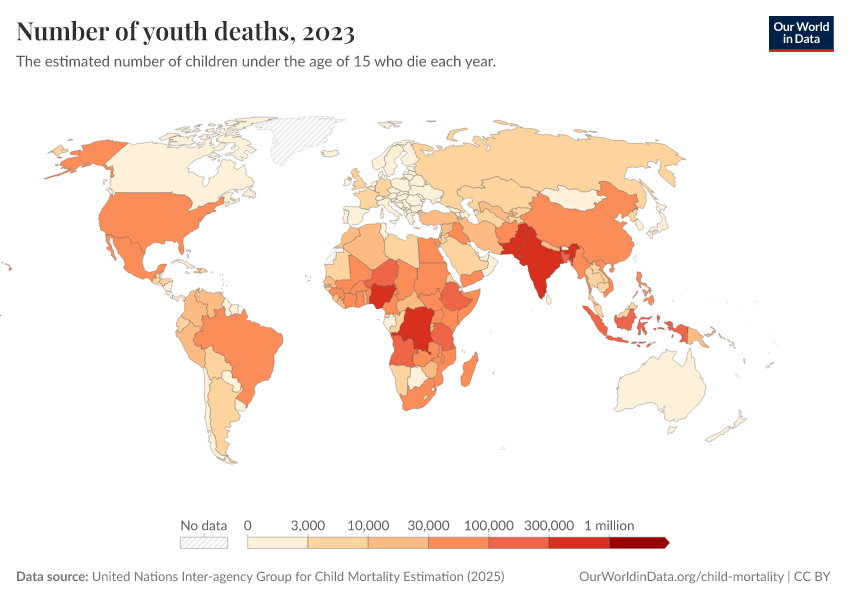 “Data Page: Under-fifteen deaths”, part of the following publication: Saloni Dattani, Fiona Spooner, Hannah Ritchie, and Max Roser (2023) - “Child and Infant Mortality”. Data adapted from United Nations Inter-agency Group for Child Mortality Estimation, UN Inter-agency Group for Child Mortality Estimation, Various sources. Retrieved from https://categorical-map-color.owid.pages.dev/grapher/number-of-youth-deaths [online resource]