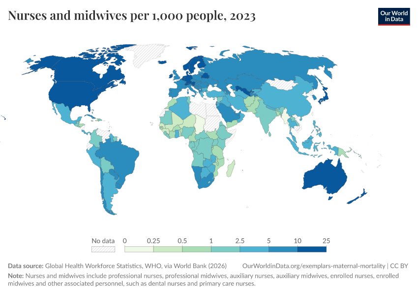 “Data Page: Nurses and midwives per 1,000 people”. Our World in Data (2026). Data adapted from Global Health Workforce Statistics, WHO, via World Bank. Retrieved from https://categorical-map-color.owid.pages.dev/grapher/nurses-and-midwives-per-1000-people [online resource]How to cite this data
