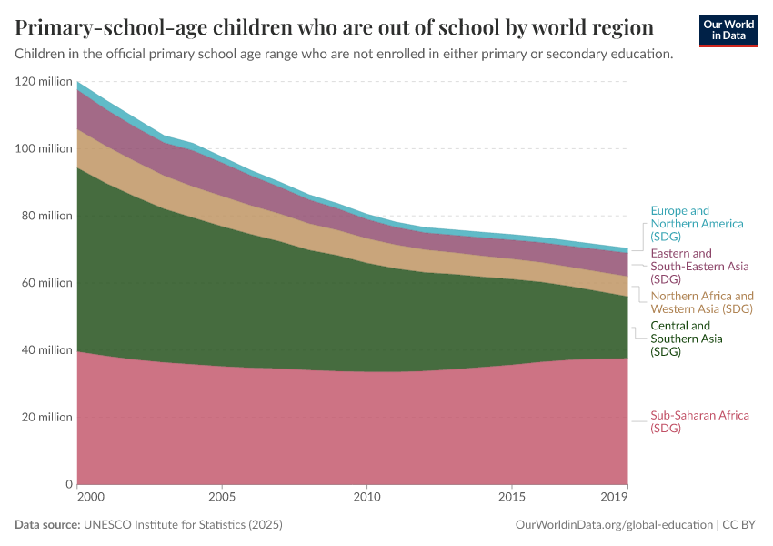 “Data Page: Out-of-school children of primary school age”, part of the following publication: Hannah Ritchie, Veronika Samborska, Esteban Ortiz-Ospina, and Max Roser (2023) - “Global Education”. Data adapted from UNESCO Institute for Statistics. Retrieved from https://categorical-map-color.owid.pages.dev/grapher/out-of-school-children-of-primary-school-age-by-world-region [online resource]How to cite this data