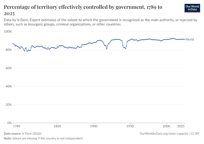 “Data Page: Territory under state control”, part of the following publication: Bastian Herre, Lucas Rodés-Guirao, and Esteban Ortiz-Ospina (2013) - “Democracy”. Data adapted from V-Dem. Retrieved from https://categorical-map-color.owid.pages.dev/grapher/percentage-of-territory-controlled-by-government [online resource]