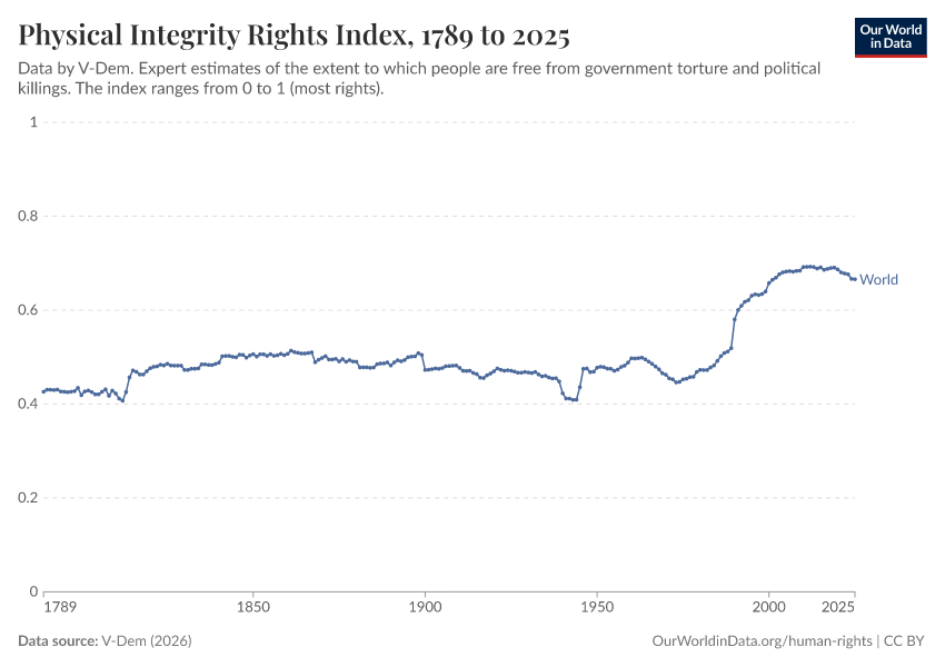 “Data Page: Physical violence index”, part of the following publication: Bastian Herre, Lucas Rodés-Guirao, and Esteban Ortiz-Ospina (2013) - “Democracy”. Data adapted from V-Dem. Retrieved from https://categorical-map-color.owid.pages.dev/grapher/physical-integrity-rights-index-vdem [online resource]How to cite this data