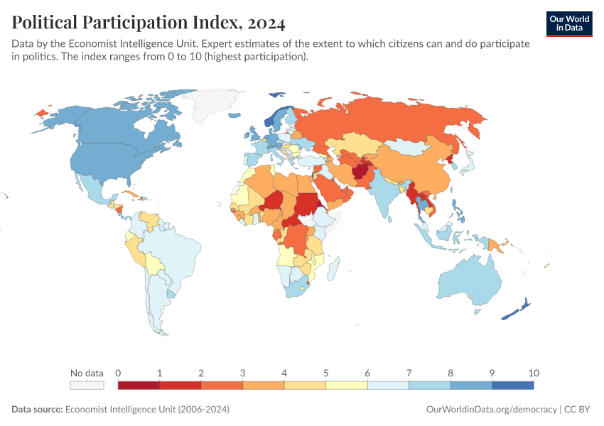 “Data Page: Political Participation Index”, part of the following publication: Bastian Herre, Lucas Rodés-Guirao, and Esteban Ortiz-Ospina (2013) - “Democracy”. Data adapted from Economist Intelligence Unit, Gapminder, Various sources. Retrieved from https://categorical-map-color.owid.pages.dev/grapher/political-participation-index-eiu [online resource]How to cite this data