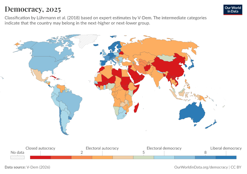 “Data Page: Political regime”, part of the following publication: Bastian Herre, Lucas Rodés-Guirao, and Esteban Ortiz-Ospina (2013) - “Democracy”. Data adapted from V-Dem. Retrieved from https://categorical-map-color.owid.pages.dev/grapher/political-regime-amb-row [online resource]How to cite this data