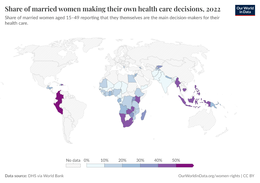 “Data Page: Share of married women making their own health care decisions”, part of the following publication: Bastian Herre, Veronika Samborska, Pablo Arriagada, and Hannah Ritchie (2023) - “Women’s Rights”. Data adapted from World Bank Gender Statistics. Retrieved from https://categorical-map-color.owid.pages.dev/grapher/proportion-of-women-who-make-their-own-informed-health-care-decisions [online resource]How to cite this data