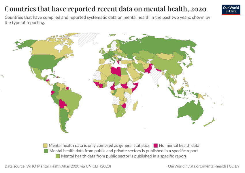 “Data Page: Countries that have reported recent data on mental health”, part of the following publication: Saloni Dattani, Lucas Rodés-Guirao, Hannah Ritchie, and Max Roser (2023) - “Mental Health”. Data adapted from WHO Mental Health Atlas 2020 via UNICEF. Retrieved from https://categorical-map-color.owid.pages.dev/grapher/reporting-of-mental-health-system-data-in-the-past-two-years [online resource]How to cite this data