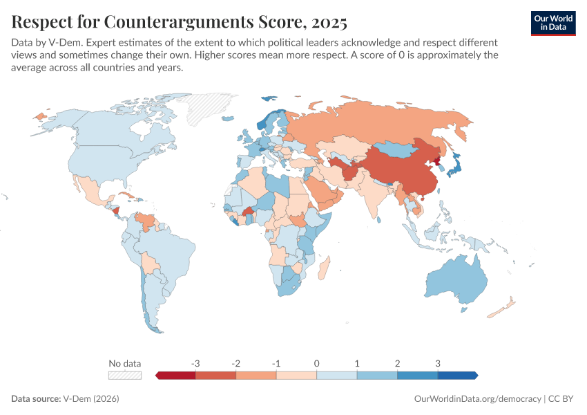 “Data Page: Respect for counterarguments”, part of the following publication: Bastian Herre, Lucas Rodés-Guirao, and Esteban Ortiz-Ospina (2013) - “Democracy”. Data adapted from V-Dem. Retrieved from https://categorical-map-color.owid.pages.dev/grapher/respect-for-counterarguments-score [online resource]How to cite this data