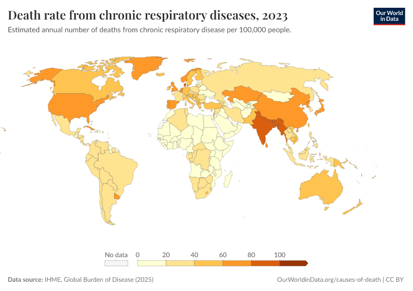 “Data Page: Death rate from chronic respiratory diseases”, part of the following publication: Esteban Ortiz-Ospina and Max Roser (2016) - “Global Health”. Data adapted from IHME, Global Burden of Disease. Retrieved from https://categorical-map-color.owid.pages.dev/grapher/respiratory-disease-death-rate-gbd [online resource]How to cite this data
