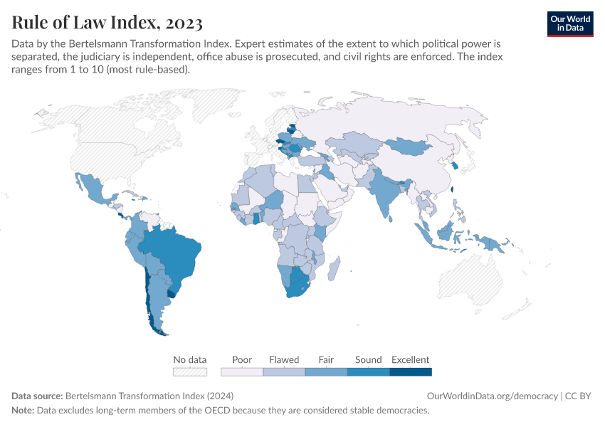 “Data Page: Rule of Law Index”, part of the following publication: Bastian Herre, Lucas Rodés-Guirao, and Esteban Ortiz-Ospina (2013) - “Democracy”. Data adapted from Bertelsmann Transformation Index. Retrieved from https://categorical-map-color.owid.pages.dev/grapher/rule-of-law-index-bti [online resource]How to cite this data