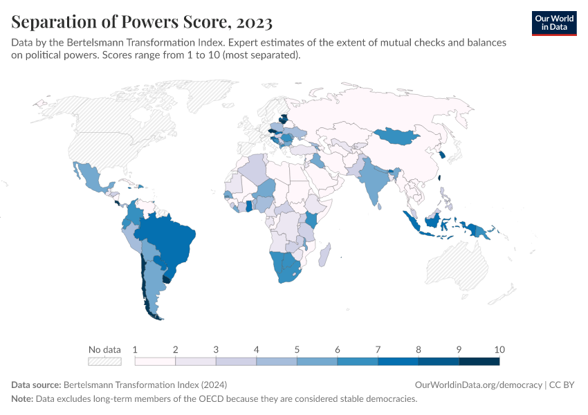 “Data Page: Separation of Powers Score”, part of the following publication: Bastian Herre, Lucas Rodés-Guirao, and Esteban Ortiz-Ospina (2013) - “Democracy”. Data adapted from Bertelsmann Transformation Index. Retrieved from https://categorical-map-color.owid.pages.dev/grapher/separation-of-powers-score-bti [online resource]How to cite this data