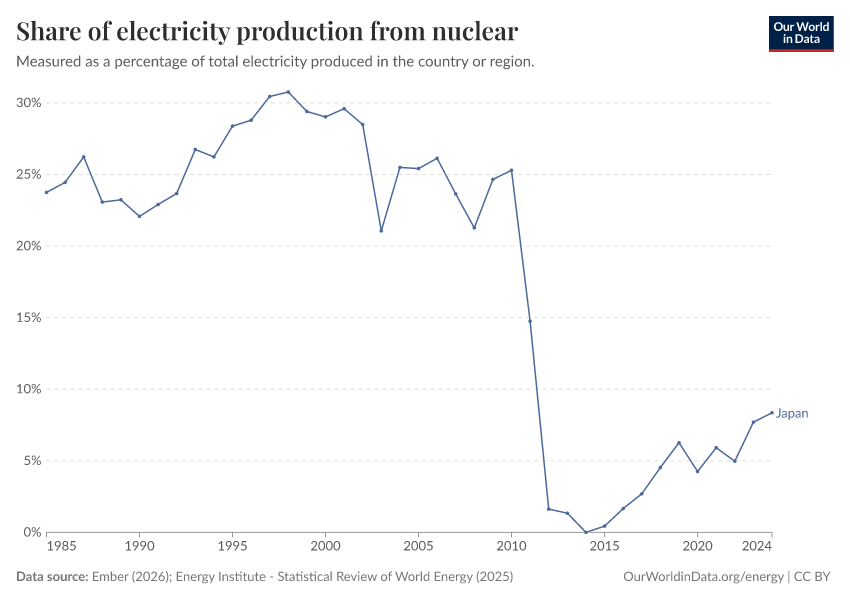 “Data Page: Share of electricity generated by nuclear power”, part of the following publication: Hannah Ritchie, Pablo Rosado, and Max Roser (2023) - “Energy”. Data adapted from Ember, Energy Institute. Retrieved from https://categorical-map-color.owid.pages.dev/grapher/share-electricity-nuclear [online resource]