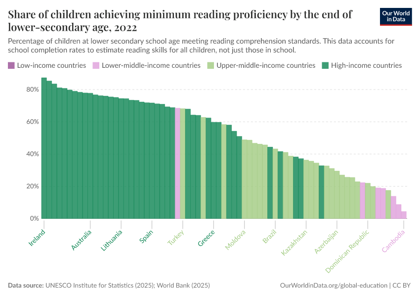 “Data Page: Share of children achieving minimum reading proficiency by the end of lower secondary age”, part of the following publication: Hannah Ritchie, Veronika Samborska, Esteban Ortiz-Ospina, and Max Roser (2023) - “Global Education”. Data adapted from UNESCO Institute for Statistics. Retrieved from https://categorical-map-color.owid.pages.dev/grapher/share-of-children-reaching-sufficient-reading-comprehension-by-the-end-of-lower-secondary-age [online resource]How to cite this data